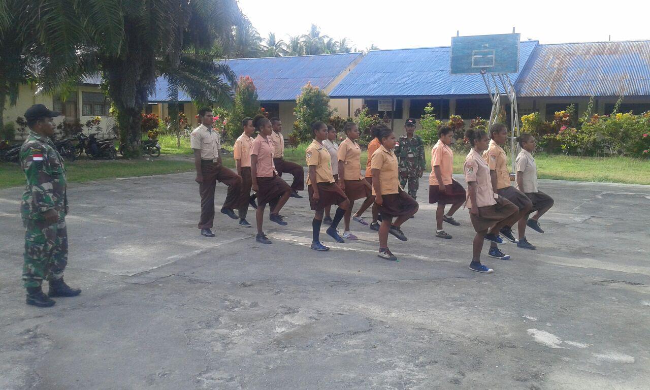 Keerom. Dalam rangka membina dan memupuk rasa cinta Tanah Air dan menanamkan sikap disiplin terhadap siswa-siswi SMU YPPK Tegasa Arso Kota, Distrik Arso Kabupaten Keerom, Babinsa Koramil 1701-04/Arso Serma Valentinus dan Serda Rony memberikan pelatihan Peraturan Baris Berbaris dan wawasan Kebangsaan terhadap 20 orang siswa-siswi SMU YPPK Tegasa. Jumat (18/3)