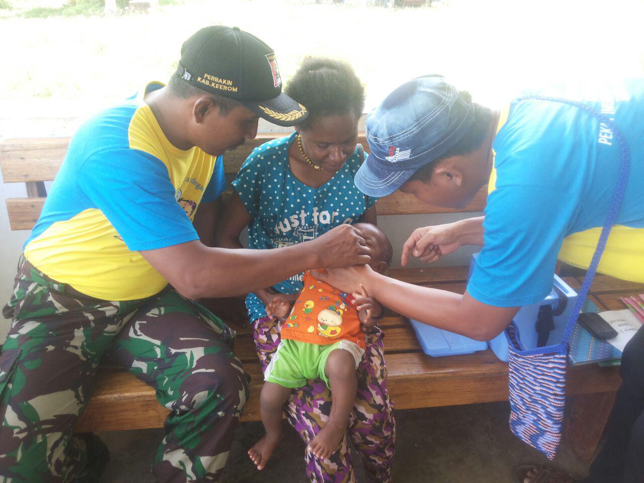 Bertempat di Puskesmas Kampung Yabanda, Distrik Senggi, Kabupaten Keerom, Babinsa Koramil 1701-06/Senggi Serma Akmal Abustan membantu 5 orang perawat Puskesmas Senggi melaksanakan Pencanangan Pin Polio di Puskesmas Kampung Yabanda terhadap 58 orang anak balita.
