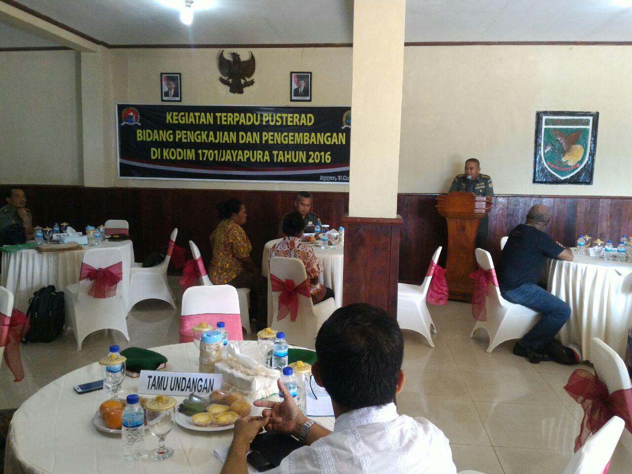 Dalam sambutannya, Dandim 1701/Jayapura yang diwakili oleh Pelaksana Tugas Harian Kasdim 1701/Jayapura yang intinya mengucapkan selamat datang kepada Tim Pusterad dan ucapan terima kasih kepada perwakilan dari SKPD Pemda Kota Jayapura dan seluruh tamu undangan yang telah hadir dalam kegiatan tersebut dan semoga dalam pelaksanaan Ruang Alat Kajian bersama Tim dari Pusterad dapat menjadi masukan sehingga dapat berguna bagi kepentingan bersama.