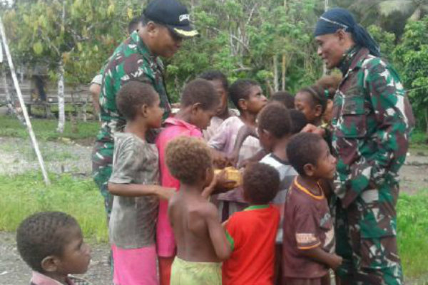 “Lihatlah, para bocah sangat senang melihat kedatangan kami ke kampung mereka, sepertinya mereka ingin menjadi tentara seperti kami,” Ujar Lettu Chk Wira Hariyono.