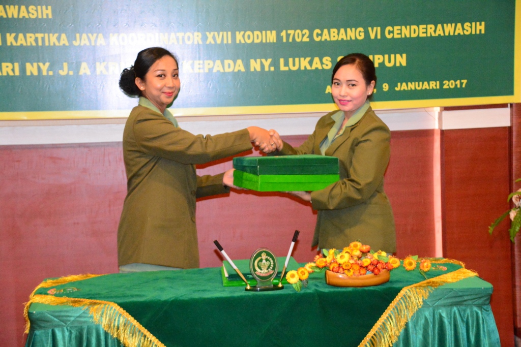 Bertempat di ruang data Makorem 172/PWY, Ketua Persit Koorcabrem 172 Ny. Boni C. Pardede memimpin serah terima jabatan ketua cabang persit Kodim 1702/Jayawijaya dari Ny. J. A Krismadi kepada Ny. Lukas Sadipun, Senin (9/1).