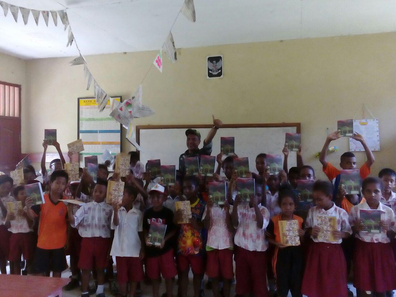 Selesai melaksanakan kegiatan belajar mengajar oleh Satgas kepada siswa-siswi SD Inpres Kampung Kwimi dilanjutkan dengan penyerahan/pemberian kenang-kenangan alat-alat tulis dan buku pelajaran/bacaan secara simbolis yang diterima langsung oleh para siswa-siswi. Pemberian alat-alat tulis dan buku pelajaran/bacaan juga akan dilaksanakan oleh Pos-Pos yang lain di seluruh jajaran Satgas.