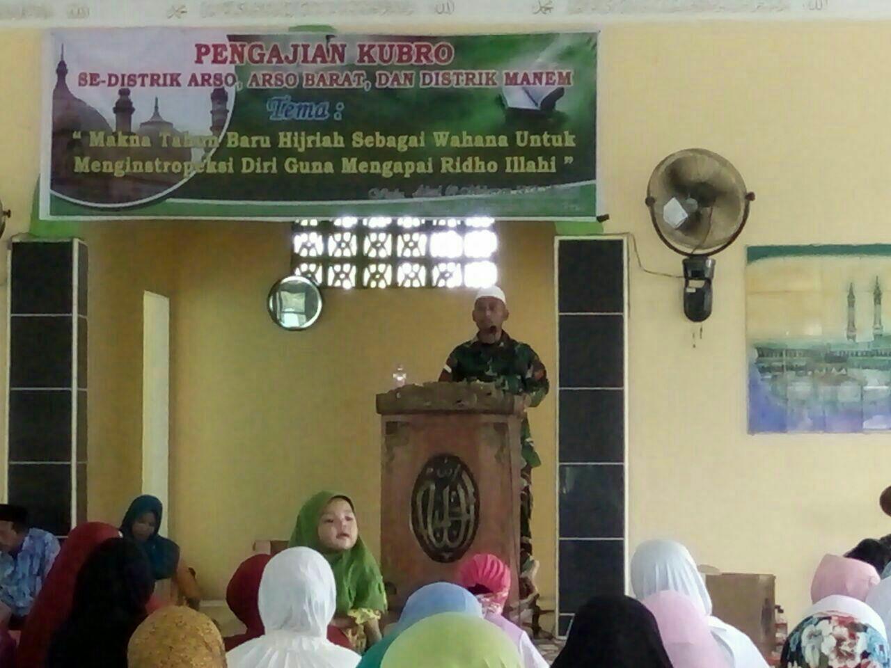 Ibu Mirva selaku Ketua Pengajian Kubro Distrik Arso Barat menyampaikan “Pengajian ini merupakan sarana untuk memepererat tali silaturahim antar Ibu-Ibu Kampung se- Distrik Arso, Arso Barat dan Distrik Manem serta bapak bapak TNI dari satgas”. terangnya