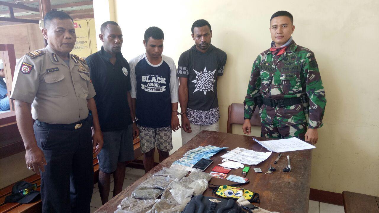 Muaratami – Di jajaran Kompi D Pos Ramil Muara Tami Satgas Pamtas 432 Kostrad telah menangkap 3 orang pembawa ganja seberat 500 gr (0,5 kilo gram) yang sudah siap edar dalam kegiatan sweeping rutin di jalan Raya lintas batas RI-PNG di depan Pos Ramil Muara Tami.
