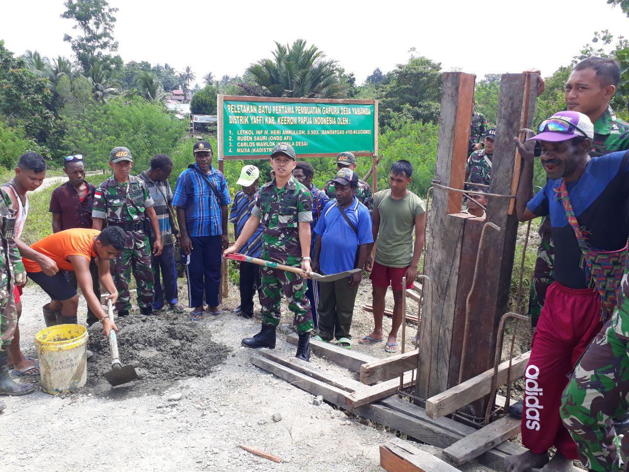 Selesai melaksanakan peresmian gapuro Pos Karang, Dansatgas melanjutkan kunjungan kerja ke Pos Yabanda untuk melaksanakan peletakan batu pertama secara simbolis pembangunan pintu gerbang Kp Yabanda Distrik Yafi, Kab Keerom yang juga dihadiri tokoh agama, kepala suku, Odoafi dan warga Kp Yabanda. Pembangunan pintu gerbang kampung ini sebagai bentuk rasa simpatik dari Dansatgas kepada warga Kp Yabanda karena selama ini warga sekitar sudah mau membantu dalam pembuatan gapuro Pos Karang.