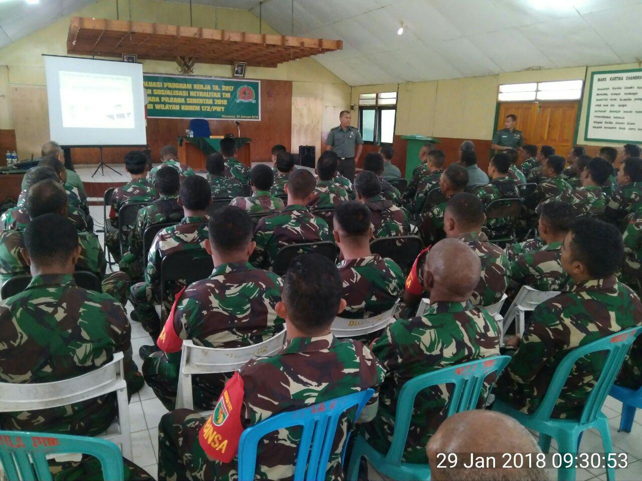 Sosialisasi yang disampaikan oleh Kasiter Korem 172/PWY Letkol Inf J. D. P Manalu dan Pasi Bhakti TNI Korem 172/PWY FN Harefa tersebut dilaksanakan di Aula Ukhumiarek Asso Makodim 1702/JWY diikuti lebih kurang 90 prajurit termasuk Kasdim 1702/JWY Mayor Inf Charluli R Jatmiko, Para Sepasi serta Para Danramil terdekat jajaran Kodim Wamena.