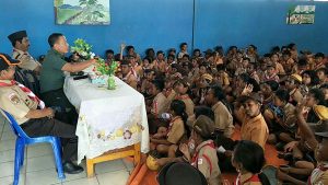 Wamena - Perwira Seksi Teritorial (Pasiter) Kodim 1702/Jayawijaya Kapten Inf Afandi memberikan pembekalan kepramukaan kepada 80 orang murid SDN 1...