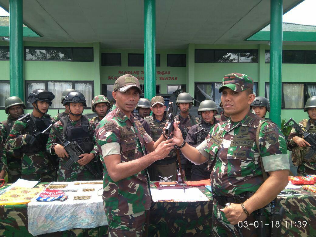 Wamena, Komandan Kodim 1702/Jayawijaya Letkol Inf Lukas Sadipun menerima tersangka WM dan barang bukti berupa 1 Cuk Senpi jenis Pistol Pietro Bereta 9 mm Made in Italy + 1 Magazen dan 114 Munisi campuran beserta barang bukti lainnya dari Mayor Inf Arif Budi Situmeang, S.I.P, M.Tr.(Han) (Danyonif 756/WMS), penyerahan tersebut dilaksanakan di depan Mayonif 756/WMS Jl. Trans Wamena – Kimbim KM-8 Distrik Hubikosi Kabupaten Jayawijaya.