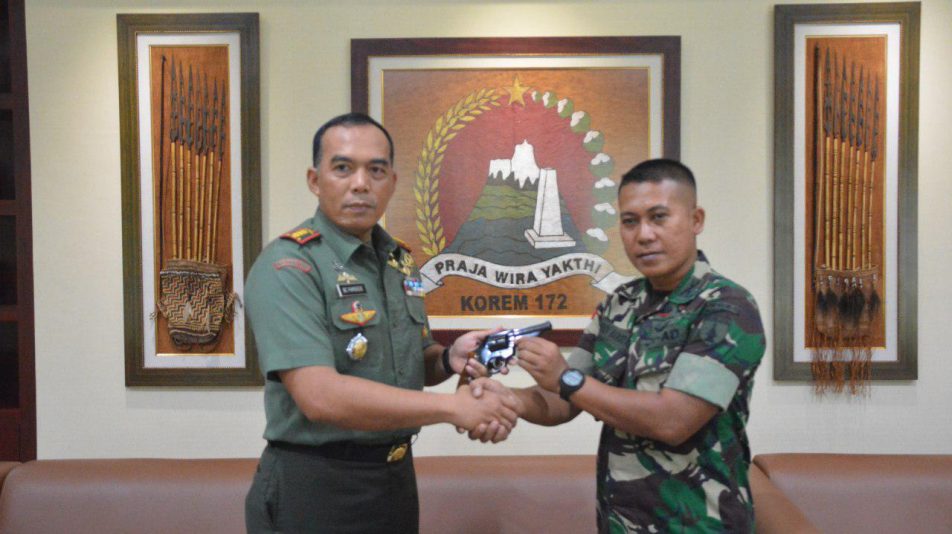 Abepura – Satuan Tugas Pengamanan Perbatasan RI-PNG Kolakops Korem 172/PWY Batalyon Mekanis 512/QY menerima sebuah cenderamata berupa 1 pucuk senjata api organik dari masyarakat kampung Umuaf Distrik Web, Kabupaten Keerom, Provinsi Papua pada selasa 9 Januari kemarin.