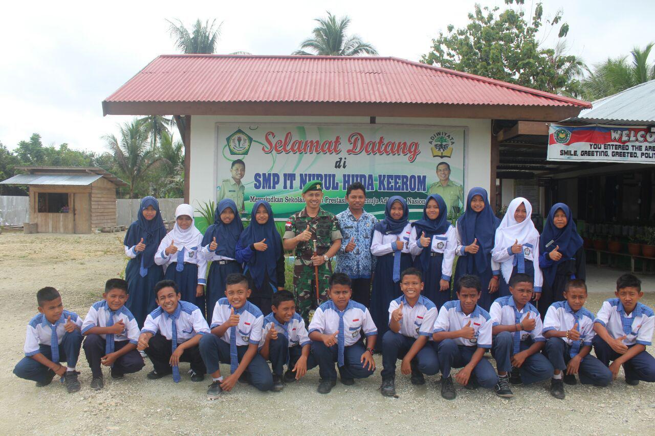 Kepala SMP IT Nurul Huda Keerom Bp Muhamad Qumarudin, S.Pd, M.Pd. memberikan apresiasi yang positif pada Dansatgas pada kunjungan ini. “Kami atas nama keluarga besar SMP IT Nurul Huda Keerom menyampaikan banyak terima kasih pada Bapak Dansatgas yang sudah menyempatkan diri untuk berkunjung kemari. Terima kasih sudah memberi motivasi pada anak-anak kami, juga atas sumbangan kitab suci Al Qur’an dan bingkisan. Ini sangat luar biasa” sambut Qumarudin.