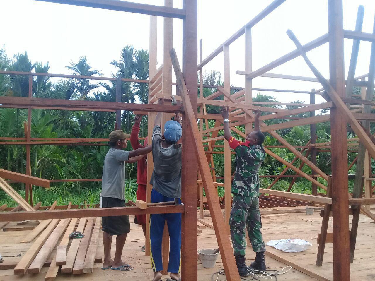 Keerom, Sertu Roni Bonai Babinsa Koramil – 04/Arso membantu pembangunan rumah warga binaannya di Kampung Yamta Pir 2 Distrik Arso Kab. Keerom, pada hari Senin (19/02/2018).