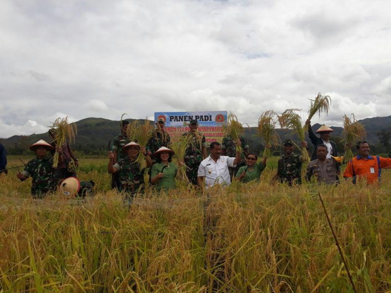 Wamena – Danrem 172/PWY Kolonel Inf Boni Christian Pardede memimpin prajurit TNI bersama perwakilan pemerintahan dan masyarakat memanen padi pada lahan seluas 61 hektare yang digarap oleh TNI dan masyarakat di Distrik Megapura, Kabupaten Jayawijaya, Provinsi Papua, Rabu.