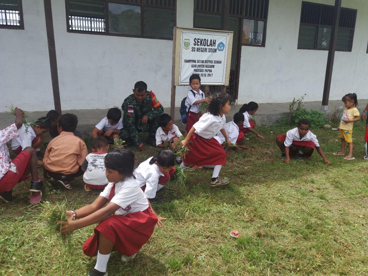 Hal ini yang mendorong Babinsa Senggi Serda Markus, untuk mendorong dan mengajak generasi muda, seperti anak-anak SD Negeri Soom Di kampung Soom, Distrik Senggi, Rabu (21/3), untuk mulai memelihara kebersihan di sekitar lingkungan sekolah.