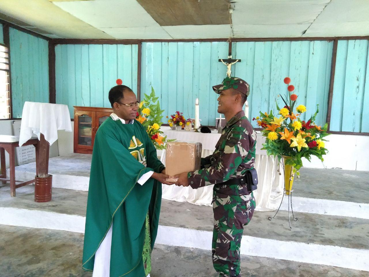 Abepura – Senin (9/7), bertempat di Kampung Kalibom Kab. Keroom, anggota Satgas Pamtas Yonif 121/MK Pos Kalibom dibawah pimpinan Serda Aserta Ginting memberikan bantuan Tali Asih Alkitab kepada Jemaat Gereja Santo Petrus yang diserahkan secara langsung kepada Pengurus Gereja Bapak Samuel dengan disaksikan oleh seluruh jemaat gereja yang hadir pada saat itu.