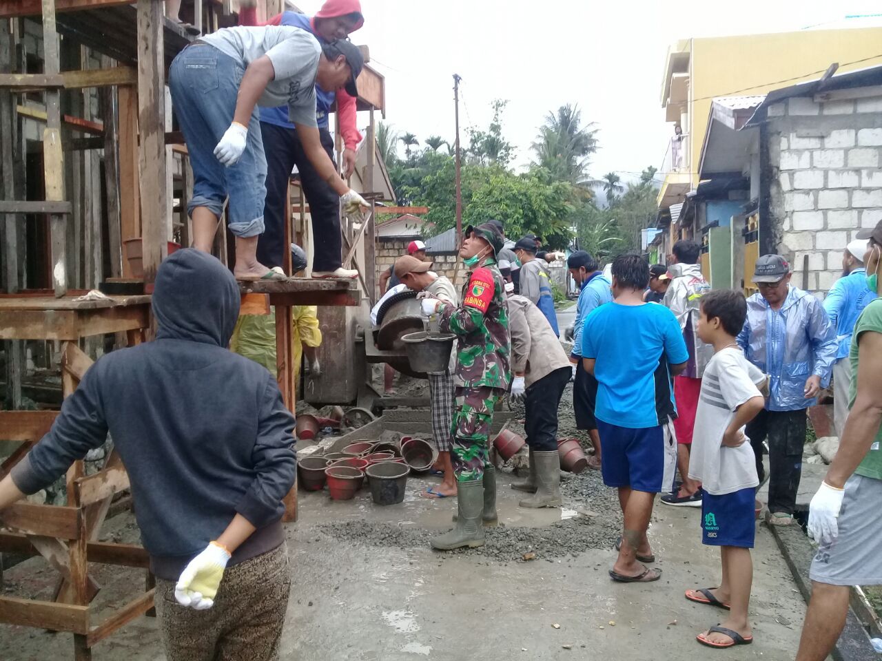Dengan penuh semangat gorong royong, seluruh warga kampung yang terlibat kerja bhakti melakukan pengecoran pada bangunan Musholla yang direncanakan dibangun 2 lantai. Kegiatan pengecoran ini membutuhkan banyak tenaga sehingga dengan kehadiran masyarakat sangat membantu dalam proses pengerjaannya, ungkap Serda Agus.