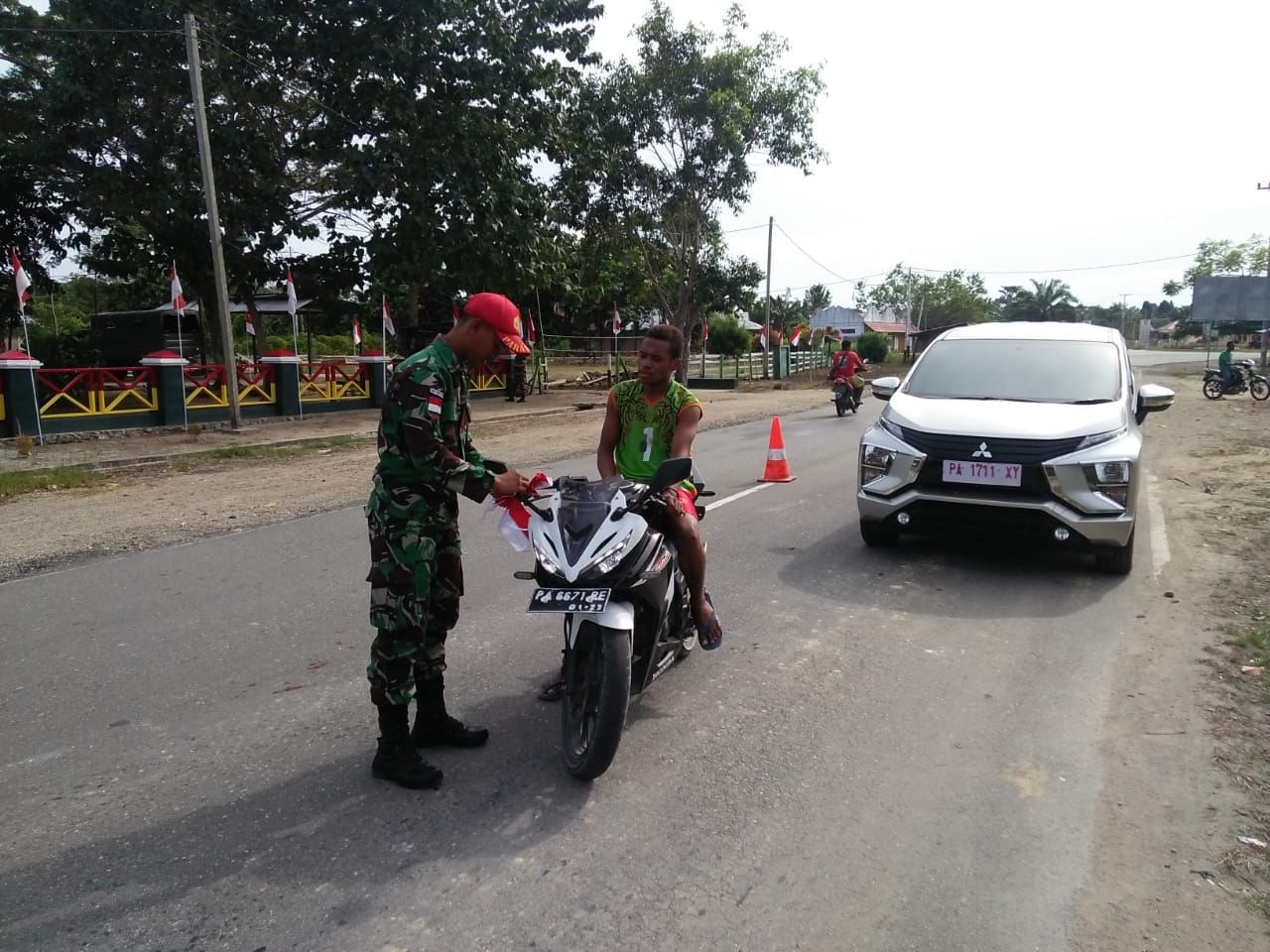 Abepura (31/7), bertempat di Distrik Muara Tami, satgas Yonif PR 501/BY dibawah pimpinan serka Gatot membagikan bendera Merah Putih kepada masyarakat pengguna jalan dalam rangka menjelang HUT kemerdekaan RI ke-73 yang akan berlangsung pada bulan agustus ini.