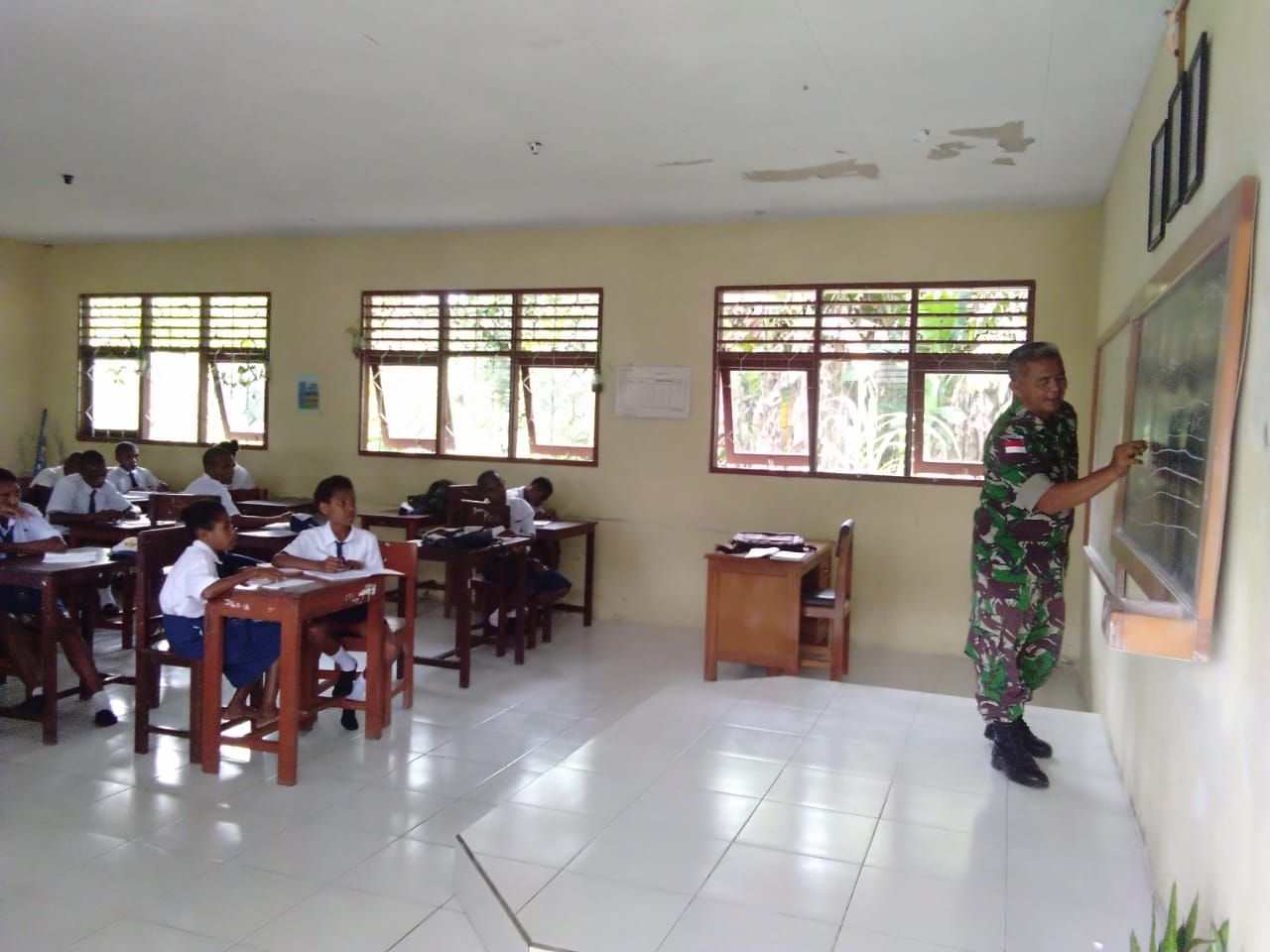Abepura (30/7), bertempat di SMP YPPK Taruna Tegasa Kampung Arso Kota Distrik Arso Kab. Keroom, Satgas 121/MK Pos Kout melaksanakan gadik dan memberikan pembekalan wasbang kepada Siswa siswi SMP YPPK Taruna Tegasa yang di pimpin oleh Lettu CHK B. Karo-karo dengan melibatkan 4 orang anggota satgas Pos Kout.
