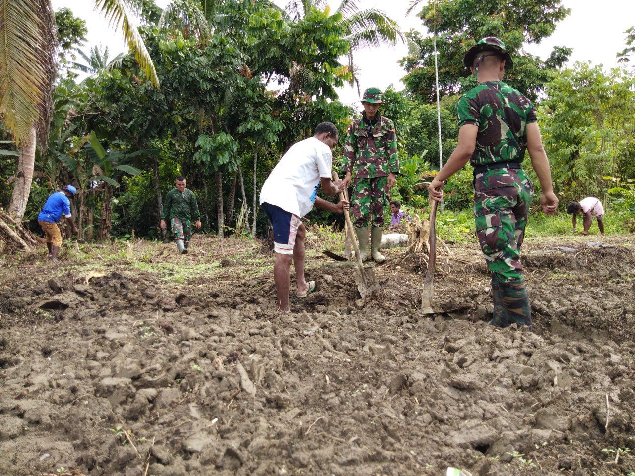 Abepura (5/9) – Sebanyak 6 orang anggota Satgas Yonif 121/MK Pos Waris dibawah pimpinan Sertu Tarmizi melaksanakan Karya Bhakti bersama masyarakat membuka lahan berkebun bertempat di Kampung Banda Distrik Waris Kab. Keroom.