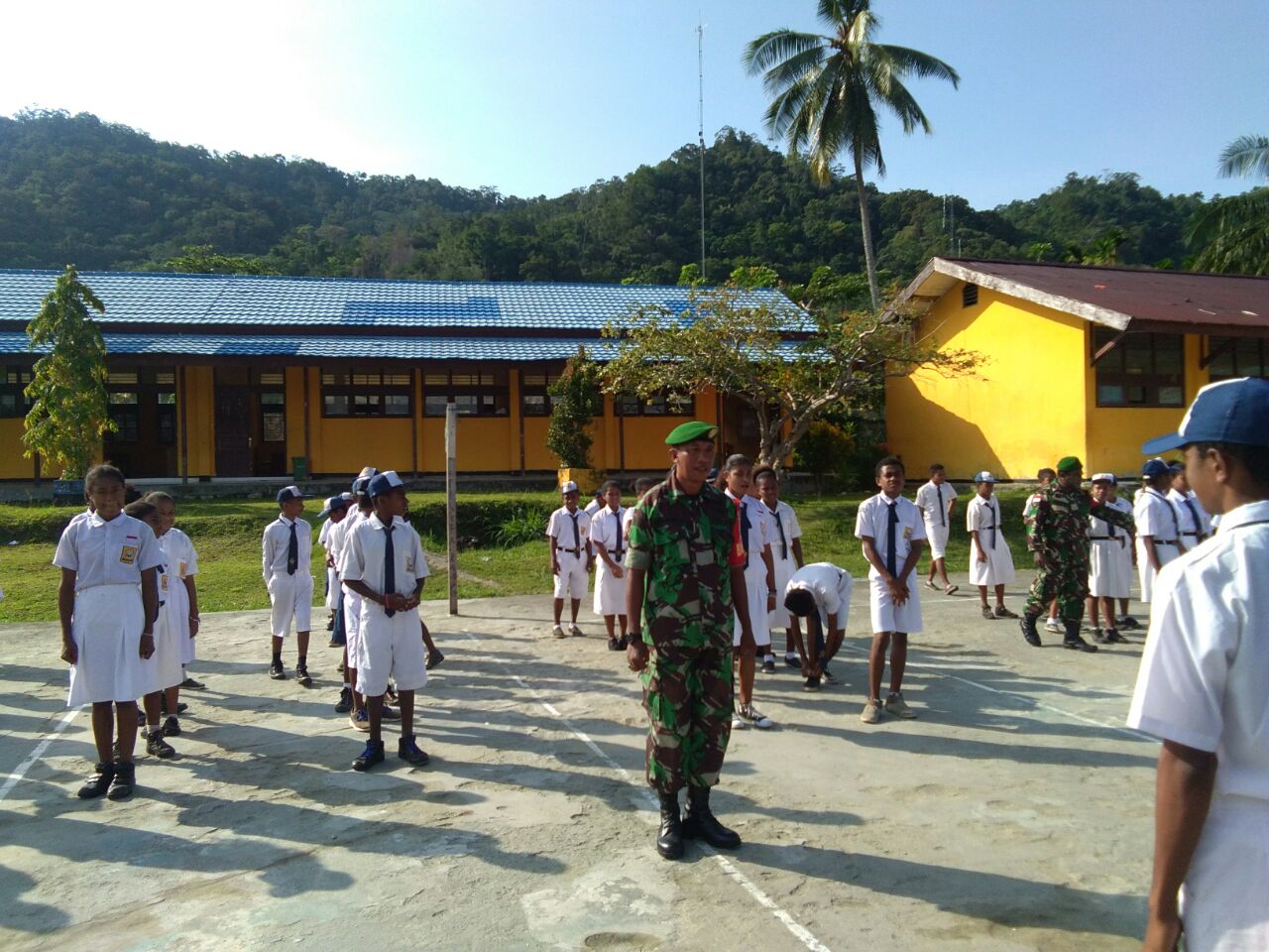 Danramil 1701-10/Depapre Kapten Inf Supriyadi mengatakan bahwa kerjasama Koramil dengan Pihak Sekolah SMPN 1 di awali dengan tatap muka bersama dan saling bersilahturahmi antara Koramil dan pihak sekolah untuk menjalin hubungan kerjasama dalam membina siswa siswi sekolah di SMPN 1 Depapre. Dan untuk mengawali nya saya telah membuat program kegiatan yang disesuaikan dengan jadwal di sekolah agar tidak mengganggu proses belajar. Sebagai contoh setiap hari senin, saya menugaskan Babinsa untuk memimpin upacara sekaligus pembekalan secara terus menerus mengenai wawasan kebangsaan agar terbentuk kualitas mental generasi muda yang tangguh dan tumbuh rasa kecintaan terhadapĀ negara bangsa dan negara, ujar Supriyadi.