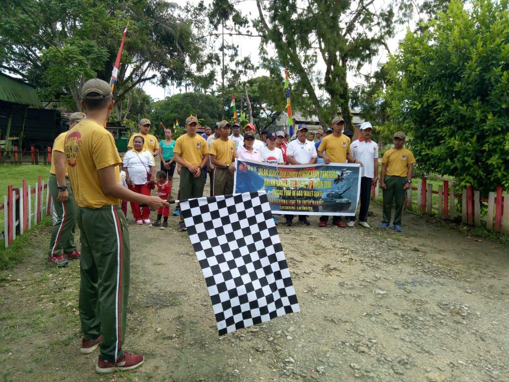 Keerom – Dalam rangka memeriahkan HUT TNI ke 73 pada hari Jumat, 05 Oktober 2018. Satuan Tugas Yonif RK 644/Wls menyelenggarakan Jalan Sehat dan Lomba Pengucapan Pancasila. Kegiatan dilaksanakan di Lapangan Bulutangkis PTPN II Arsotami Distrik Mannem Kab. Keerom.
