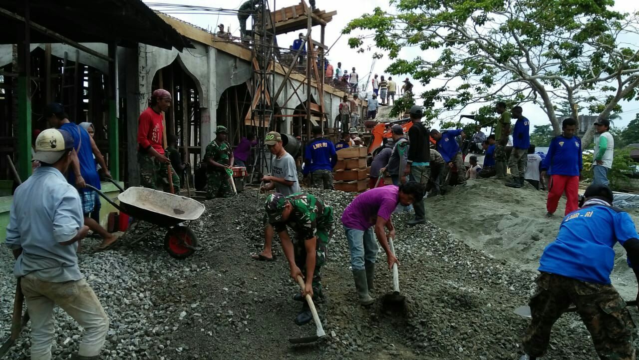 Atas dasar pentingnya kebutuhan rumah ibadah, maka anggota Satgas Yonif 121/MK Pos Workwana berinisiatif untuk meringankan pekerjaan pembangunan Masjid dengan mengajak anggota Ormas LMRI untuk turun ke lapangan melakukan kerja bakti melalui pengecoran bangunan yang membutuhkan tenaga yang maksimal dilapangan.