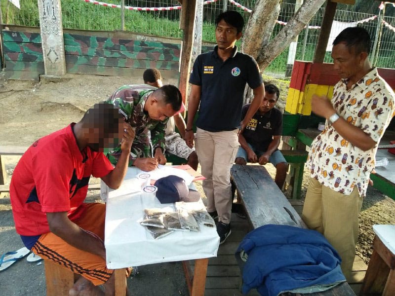 Selesai melaksanakan pemeriksaan dan mengambil keterangan dari ketiga warga tersebut Danpos Lettu Chb M. Reza Nasution melakukan koordinasi dengan pihak Kepolisian yaitu Satnarkoba Polres Keerom untuk diserahkan dan menjalani proses selanjutnya.