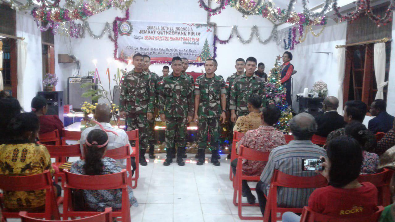 Keerom – Prajurit Satgas Yonif 126/KC Pos Pir IV yang beragama Kristen merayakan Natal bersama dengan Jemaat Gereja Bethel di Gereja Bethel Pir IV, Kampung Wonorejo, Distrik Mannen, Keerom hari Selasa (18/12/2018).