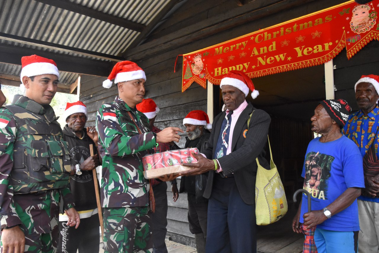 Jayapura – Komandan Korem (Danrem) 172/PWY Kolonel Inf J Binsar P Sianipar membagikan bingkisan Natal berupa topi sinterklas dan makanan ringan kepada warga Mbua, Distrik Mbua, Kabupaten Nduga, Provinsi Papua, Senin (24/12).