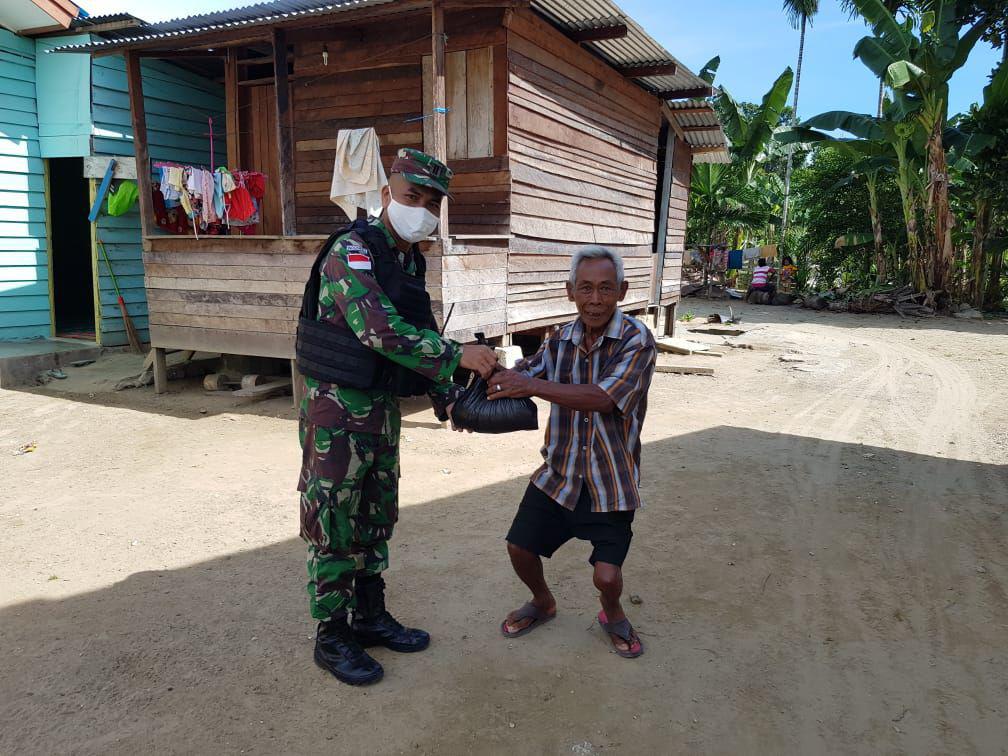 Danki C Satgas Pamtas Yonif 713/ST Lettu Inf Karies Frengki Simajuntak bersama tim menyalurkan zakat fitrah kepada kaum dhu’afa dan fakir miskin yang berada sekitaran Kampung Buton Skouw Mabo Distrik Muara Tami Kota Jayapura Provinsi Papua. Jumat (22/05/2020)