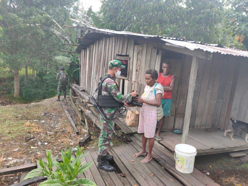 Abepura – Satgas Pamtas Yonif Raider 300/Bjw, Pos Kalibom di pimpin Sertu Soni Sonjaya dan 6 orang anggota melaksanakan patroli keliling kampung sambil berikan bantuan sembako kepada warga di Kampung Kalibom, Distrik Waris.