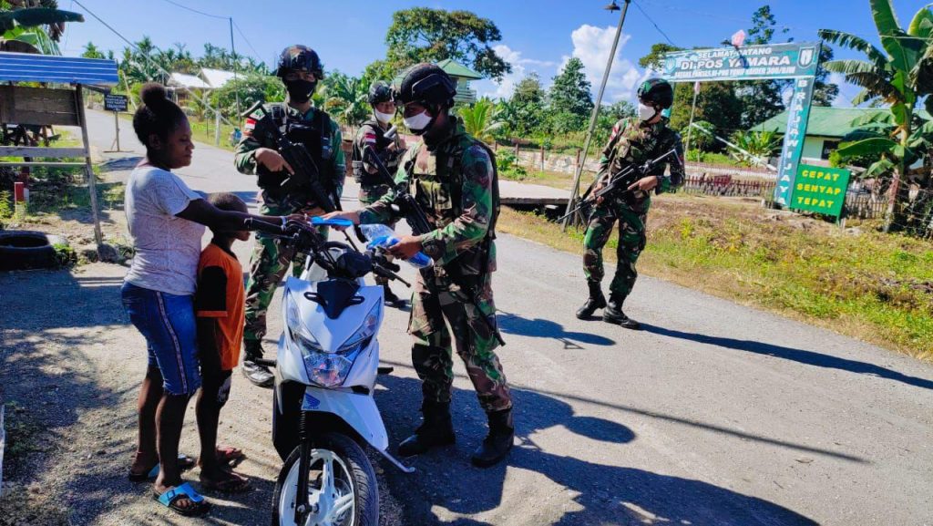 Satgas Pamtas Yonif Raider 300/Bjw, Pos Yamara dipimpim Serda Pardede melaksanakan pemeriksaan kendaraan dan bagikan masker gratis kepada masyarakat di Kampung Yamara, Distrik Mannem.