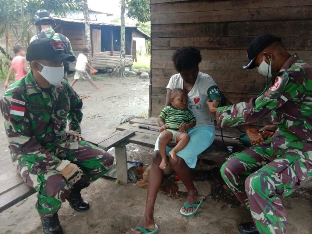 Abepura – Satgas Pamtas Yonif Raider 300/Bjw, Pos Waris dipimpin Sertu Agus Sutisna memberikan pelayanan kesehatan di Kampung Banda, Distrik Waris.