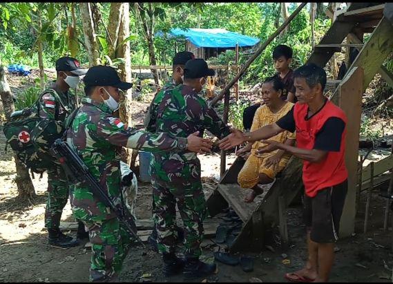 Satgas Pamtas Yonif Raider 300/Bjw, Pos Km 76 Di pimping Letda Inf Yusmanto melaksanakan anjangsana dan membagikan sembako kepada masyarakat binaan sekitar Pos Km 76, Distrik Mannem.