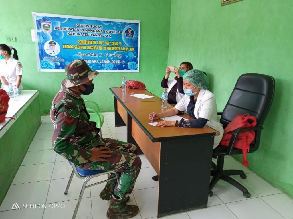 Seperti yang terlihat di Makoramil 1702-04/Tiom, personil Koramil bersama satgas pamrahwan dan satgas pamtas RI-PNG melaksanakan rapid test dari RSUD Tiom, Senin (1/6).