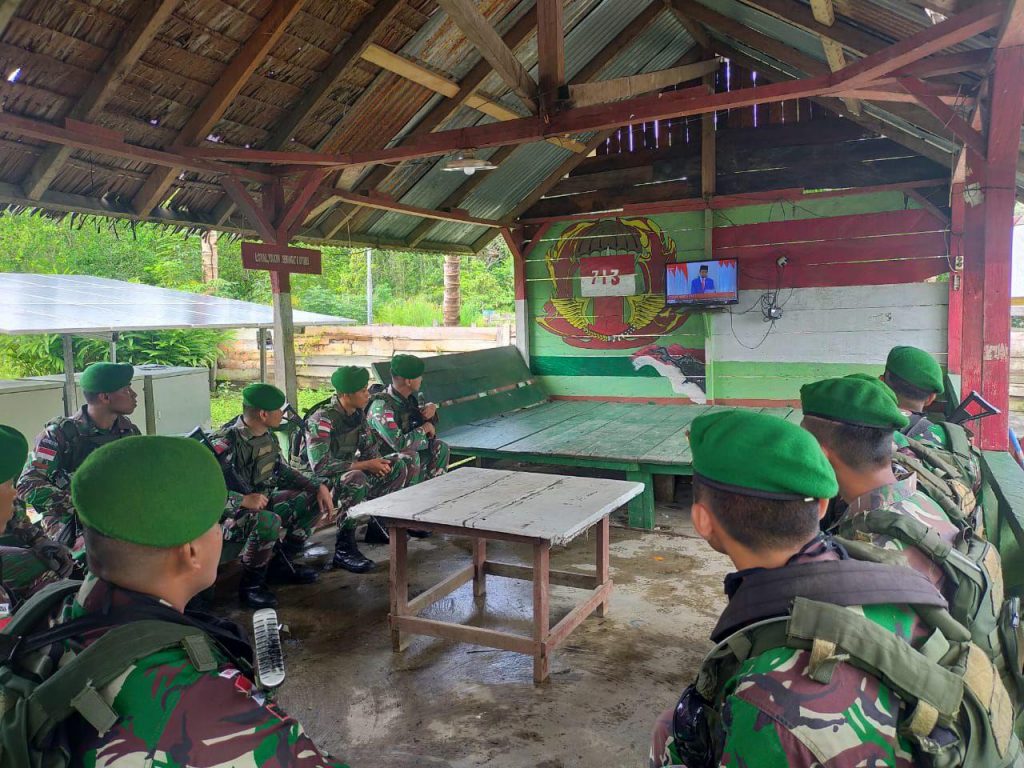 Dan tidak ketinggalan dengan Satgas Yonif 713/ST dengan seluruh jajarannya yang saat ini melaksanakan tugas pengamanan Perbatasan RI-PNG sektor utara mendapatkan kesempatan untuk menyaksikan bersama Pidato Kenegaraan bapak Joko Widodo Presiden Republik Indonesia. Senin (01/06/2020)