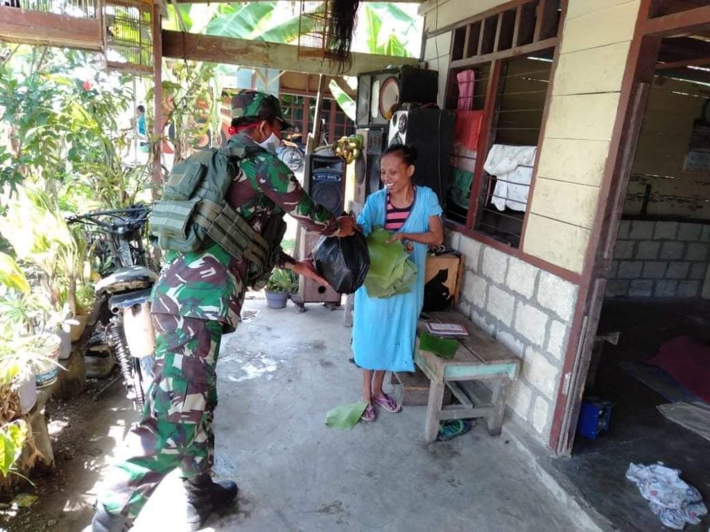 Akibat dari Pandemi Covid-19 yang sampai saat ini belum ada titik terangnya kapan akan berakhir walaupun pemerintah dengan seluruh elemen masyarakat Indonesia sudah bekerja keras untuk menghambat penyebarannya. Dampak dari Pandemi Covid-19 yang berkepanjangan yang mengharuskan masyarakat harus mengurangi aktivitasnya di luar rumah dalam hal ini mencari nafkah sehingga kehidupan ekonomi masyarakat semakin sulit. Melihat kondisi demikian hati nurani Personil Satgas Yonif 713/ST terketuk untuk membantu masyarakat dengan menyisihkan sebagian rejekinya untuk diberikan kepada masyarakat.