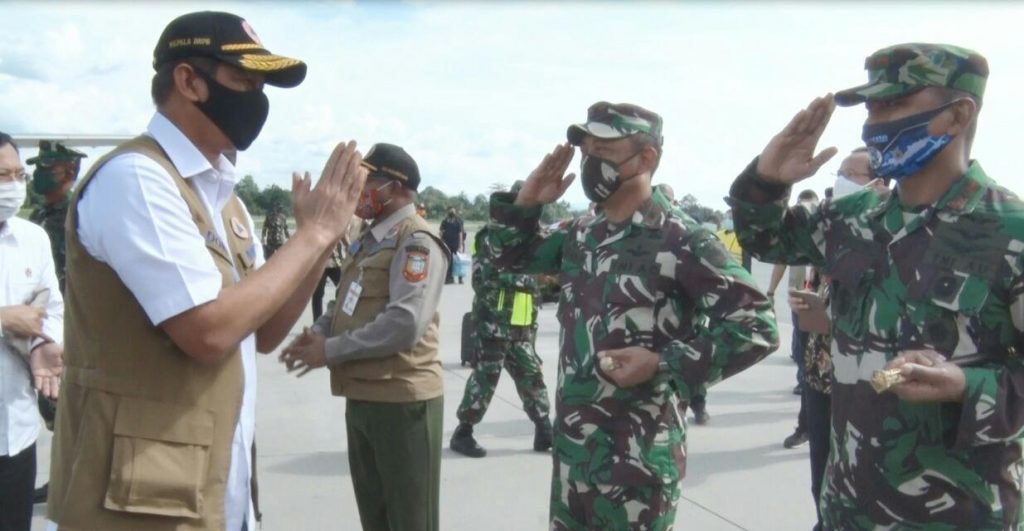 Abepura – Panglima Kodam XVII/Cenderawasih Mayjen TNI Herman Asaribab bersama Danrem 172/PWY Brigjen TNI Izak Pangemanan menyambut kunjungan kerja Kepala Badan Nasional Penanggulangan Bencana (BNPB) Letjen TNI Doni Monardo selaku Ketua Gugus Tugas Nasional percepatan dan Penanganan covid-19 dalam kunjungan kerjanya bersama Menko PMK Prof. Dr. Muhadjir Effendy, S.Pd., M.A.P. dan Menteri Kesehatan RI Letjen TNI (Purn) Dr. dr. Terawan Agus Putranto, Sp.Rad. beserta rombongan ke Papua bertempat di Bandara Sentani Jayapura, Selasa (7/7).