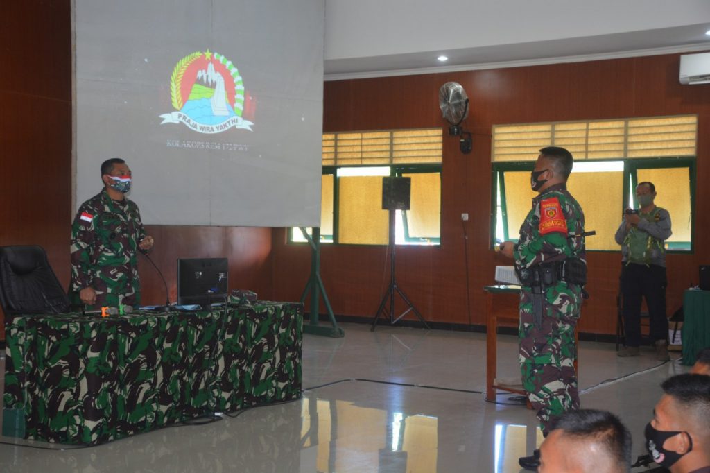 Abepura – Komandan Korem (Danrem) 172/PWY selaku Komandan Komando Pelaksana Operasi Brigjen TNI Izak Pangemanan memberikan materi pembekalan kepada 450 prajurit Satuan Tugas Pengamanan Perbatasan (Satgas Pamtas) RI-PNG Yonif Mekanis 413/Bremoro, bertempat di Ruang Kelas Asah Asih Asuh Dodik Bela Negara Rindam XVII/Cenderawasih, Distrik Sentani, Kab. Jayapura, Selasa (14/7).