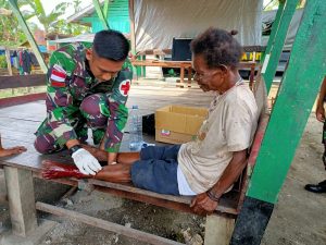 Keerom – Tim Kesehatan Pos Kout Satgas Pamtas Yonif 312/KH memberikan pertolongan pertama kepada Ibu Melau Waybery (47) yang terkena...