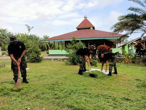 Keerom - Pos Kout Satgas Pamtas Yonif 312/Kala Hitam bersama warga membersihkan Masjid Ubudiyah di Kampung Workwana, Distrik Arso, Kabupaten...