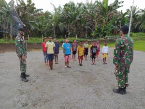 Keerom – Dalam rangka mewujudkan TNI sebagai sahabat anak, Prajurit Pos Kotis Satgas Pamtas Yonif 312/Kala Hitam mengajar murid Paud...