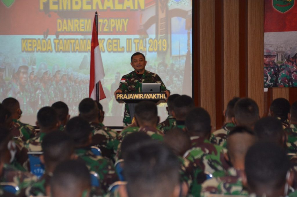 Abepura – Sebanyak 171 orang personel Tamtama Remaja lulusan Dikmata TNI AD TA. 2019 yang akan melaksanakan tugas sebagai Babinsa, menerima pembekalan dari Komandan Korem 172/PWY Brigjen TNI Izak Pangemanan bertempat di Aula Praja Wira Yakti, Selasa (1/9).