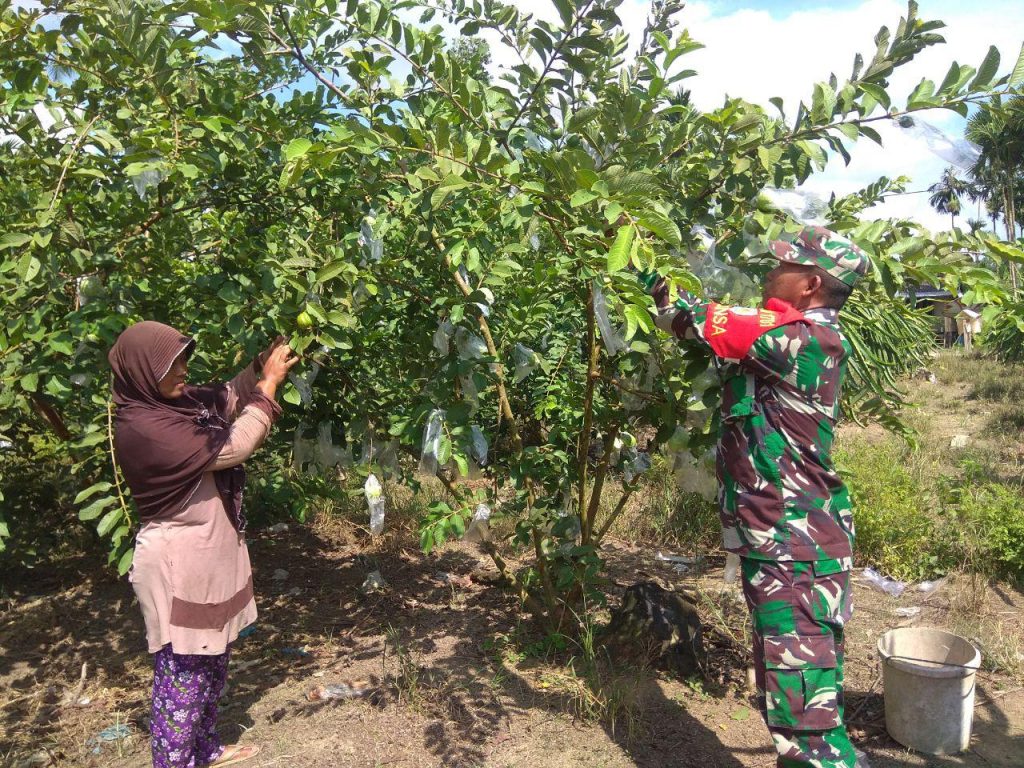 Pada tgl 12-9-2020 pukul. 09.00 Wit s/d selesai Babinsa Koramil 1701-23/Skanto Kopda Miswanto membantu Petani jambu kristal di kampung Wulukubun distrik Skanto kab Keerom dengan membungkus buah- buah jambu agar tidak busuk terserang lalat buah dan hama/ penyakit. Sehingga buah dapat masak sempurna hingga masa panen.