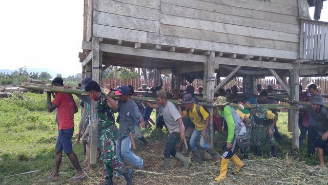 Jayapura – Satgas Pamtas RI-PNG Yonif Mekanis Raider 413 Kostrad Pos Muara Tami bersama masyarakat gotong royong membantu pindah rumah Bapak Abdul Salam (62) salah satu warga Kampung Skouw Sae Distrik Muara Tami Kota Jayapura.