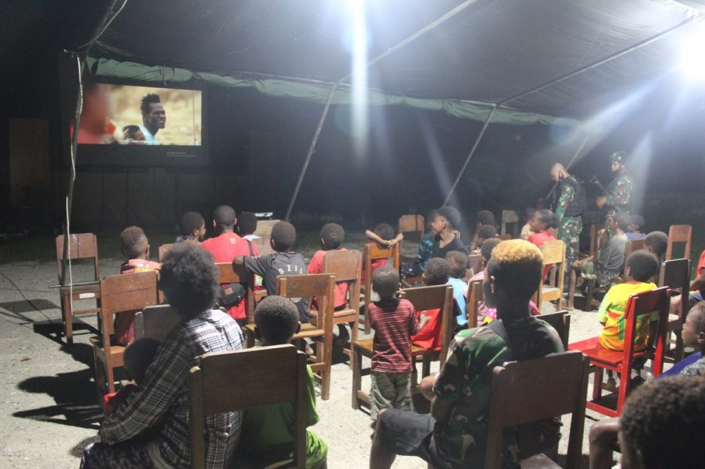 Papua-Jauh dari hiruk pikuknya kota-kota besar dimana anak anak pada umumnya dapat menonton bioskop,Televisi. Terinspirasi dari hal tersebut Satgas Pamtas RI-PNG Yonif Raider 100/PS gelar nonton bersama (Nobar) di Kampung Banda dengan peralatan layar tancap yang sudah disiapkan sejak sebelum berangkat operasi.