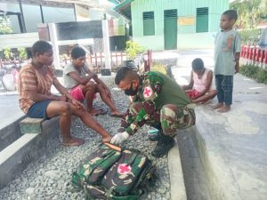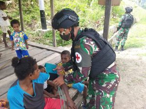 Keerom-Personil tarkes pos kalilapar Pratu AK Harahap berikan pelayanan kesehatan pada warga yang datang berobat di Pos Kalilapar Satgas Yonif...