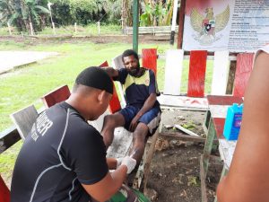 Keerom-Satgas pamtas RI-PNG Yonif Raider 100/PS Pos Yamara memberi pertolongan pertama kepada Bapak Agus yang mengalami luka dibagian kaki karena...