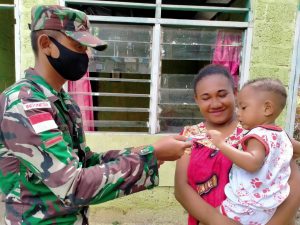 Satgas Pamtas RI-PNG Yonif Mekanis Raider 413 Kostrad Pos Nafri memberikan gula-gula kepada anak perbatasan di Kampung Nafri Distrik Abepura...