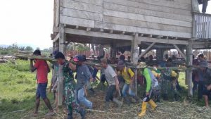 Jayapura – Satgas Pamtas RI-PNG Yonif Mekanis Raider 413 Kostrad Pos Muara Tami bersama masyarakat gotong royong membantu pindah rumah...