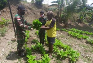 Keerom -Berbagi kebahagian berupa hasil panen tanaman kepada masyakarat perbatasan, Prajurit Satgas Pamtas RI-PNG Yonif Raider 100/PS Pos Waris membagikan...